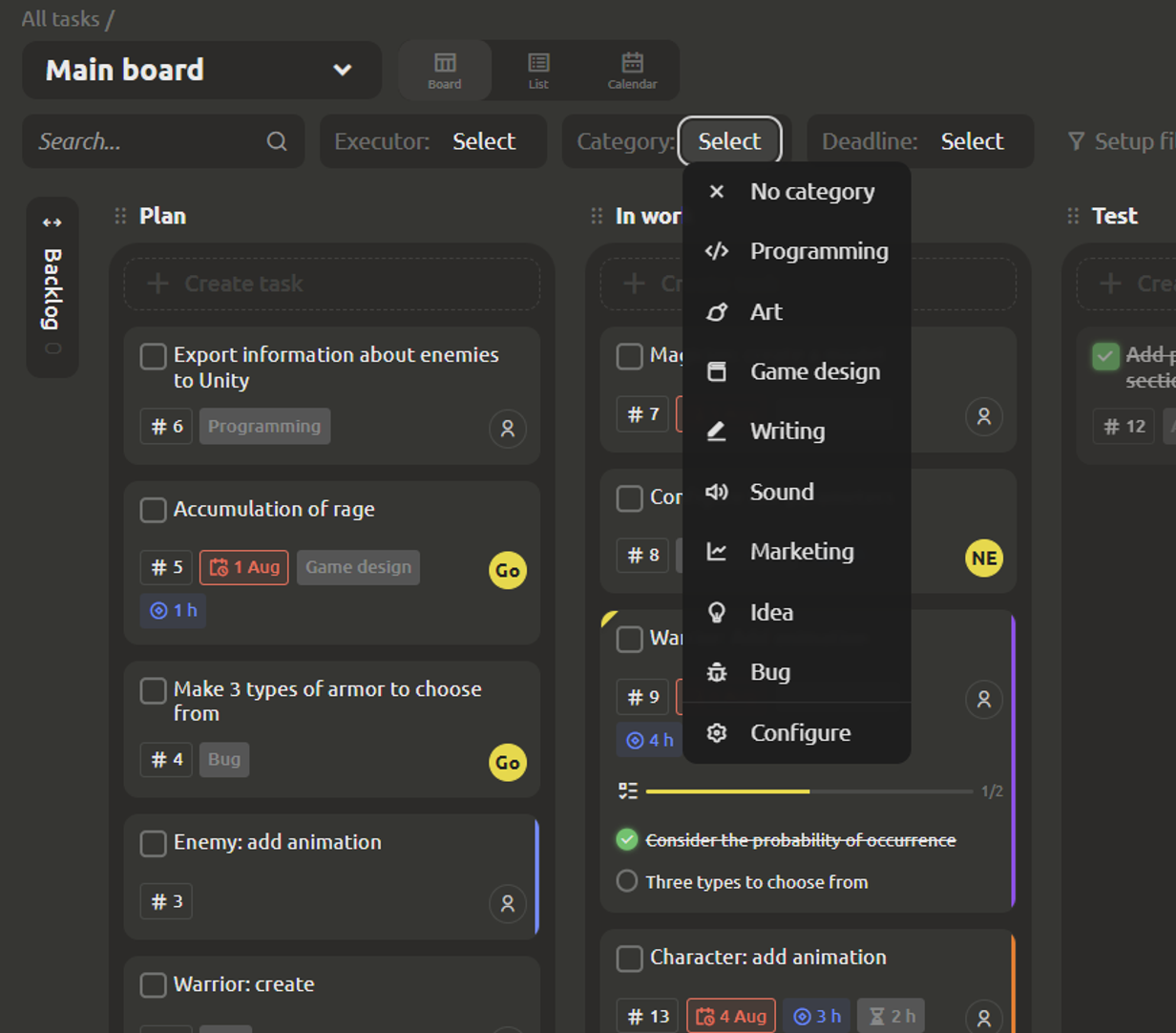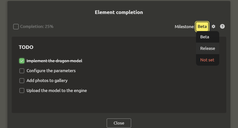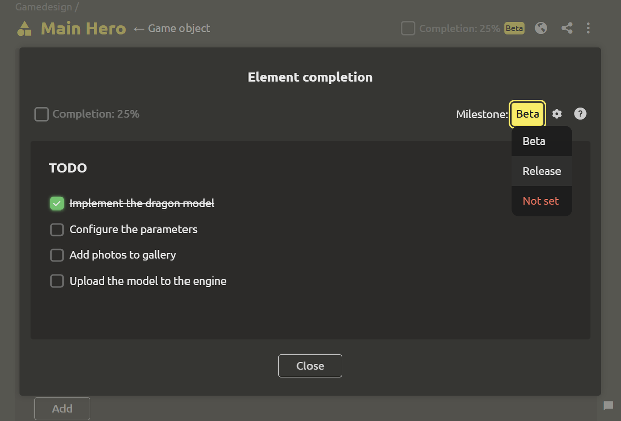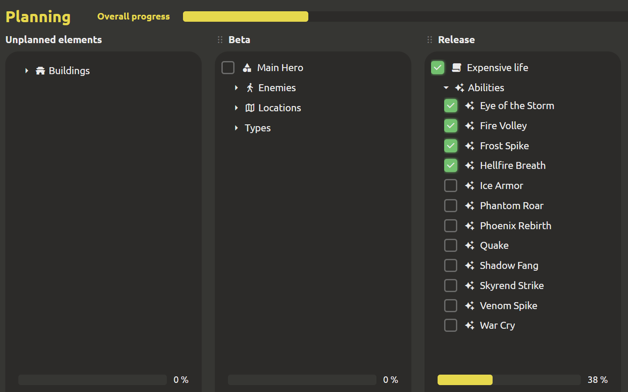 In the planning section, you can add custom milestones: upcoming exhibitions, festivals, playtests, etc. Then, attach project parts to these milestones that must be completed by the given event and track their progress.
