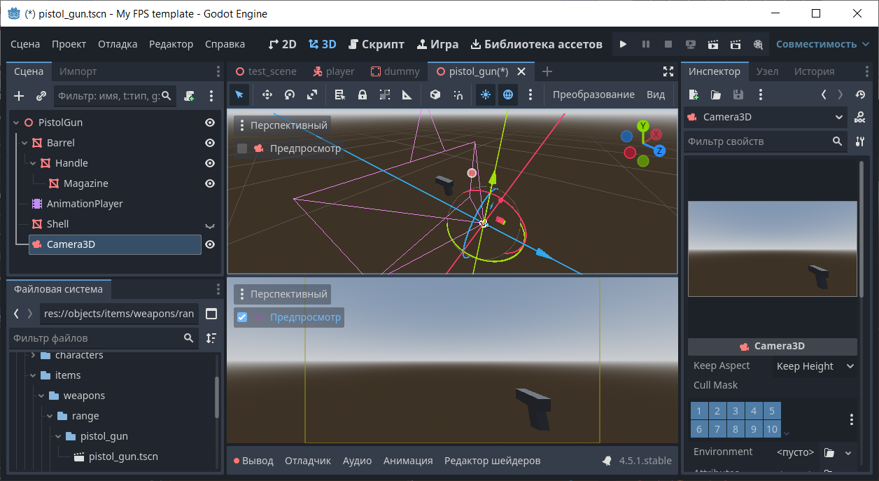 Во-вторых, для удобства предпросмотра измените вид вьюпорта, разделив его на 2 окна (рис. 16), и добавьте камеру на сцену пистолета. При выборе камеры, на каждом окне вьюпорта появится флажок “Предпросмотр”. Включите на одном из окон предпросмотр и теперь вы видите сцену и в свободном виде, и как она будет представлена у игрока (рис. 17).