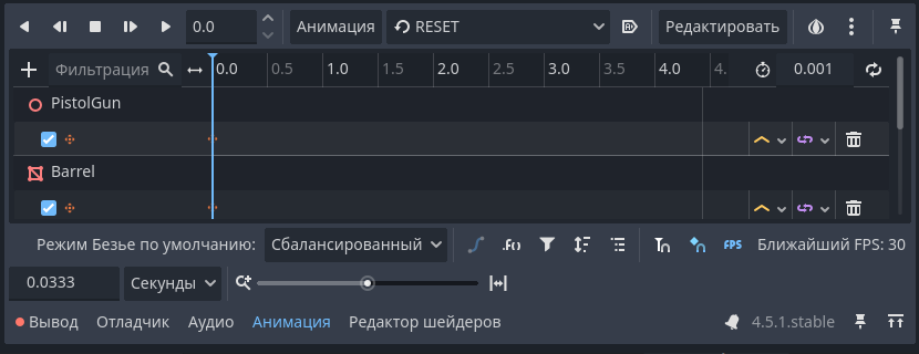 На вопрос “Создавать ли дорожку сброса RESET” соглашайтесь. В инспекторе, если выделен добавленный ключ, появится значение положения, в котором находится пистолет в этом ключевом кадре. Перемещаете ползунок времени в конечное положение для пистолета, отодвигаете пистолет на сцене, фиксируете ключевым кадром (аним. 1).