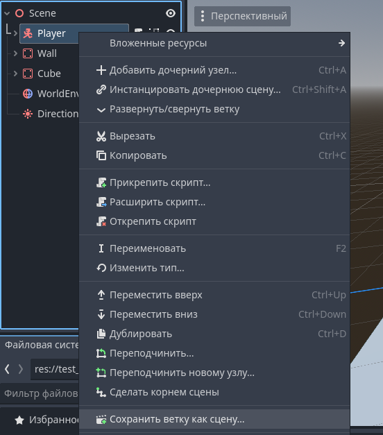 У нас есть уровень, и персонаж в нем, которым мы управляем. Они сейчас единое целое, и надо это исправить, так как наш персонаж может существовать и вне этого уровня. Переименуйте корневой узел игрока в “Player”, если вы забыли это сделать, как я на скриншотах из первой части, и нажмите ПКМ (правую кнопку мыши). В выпавшем меню выберите “Сохранить ветку как сцену” (рис. 1) и сохраните персонажа, пока снова в корень проекта с названием “player.tscn”. Флаги на “Сбросить позицию”, “Сбросить вращение”, “Сбросить масштаб” можно оставить как есть.