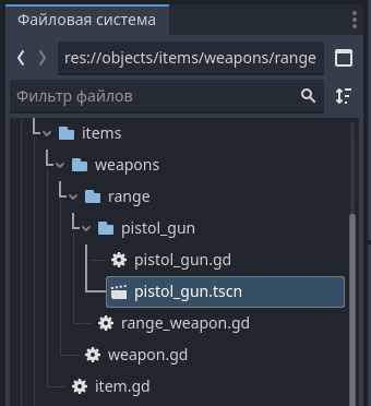 animation_player.play("shoot")Позднее в пустых классах будут описываться общие возможности для каждого вида предметов. Переходим к сборке всего этого вместе.