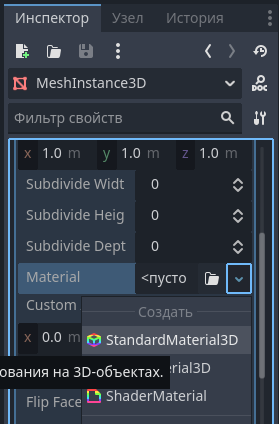 Создадим сцену со статичным (StaticBody3D узел) объектом, но для выделения его из серой белой массы уже присутствующих мешей на сцене надо придать ему красок. У созданного меша в MeshInstance3D добавим материал StandardMaterial3D (рис. 12), и во вкладке “Albedo → Color” установите цвет. Я выбрал “dc4b6e”, а сцену назвал “Dummy” (болванчик).