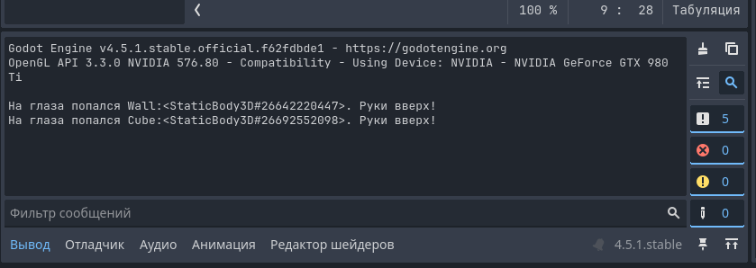 print("На глаза попался ", collider, ". Руки вверх!")Пояснения к коду: