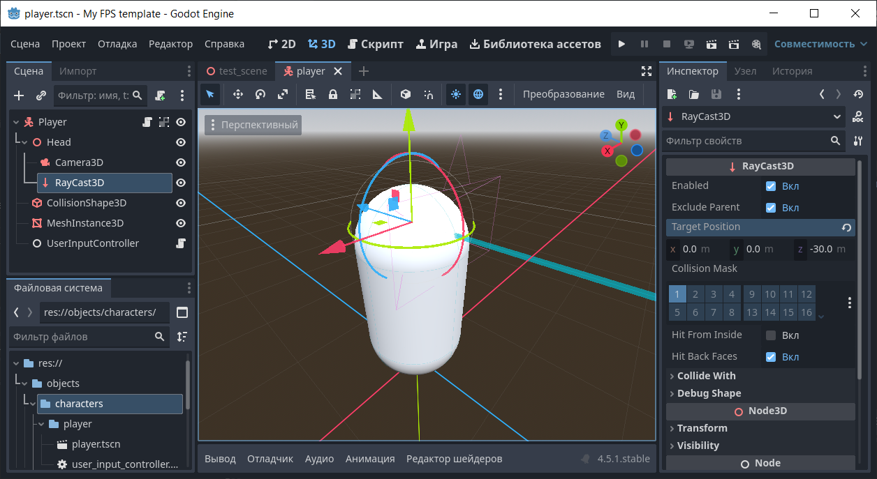 Для начала, давайте научим персонажа видеть то, что за объект находится перед ним и влиять на этот объект. Нам поможет RayCast3D – палочка-проверялочка на пересечения с объектами и областями.