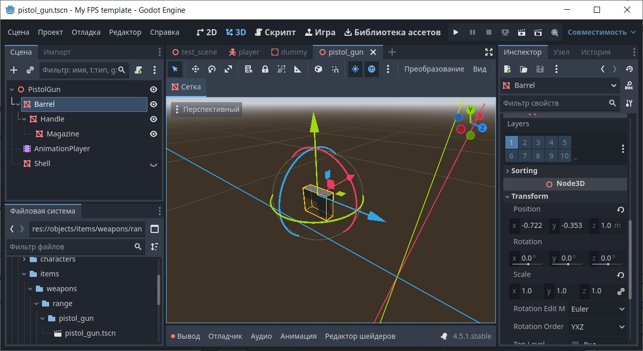 Пистолет будет относиться к оружию дальнего боя. А значит, создайте сцену для пистолета (классы отложим на потом). Для создания меша я буду использовать набор MeshInstance3D и из примитивов соберу что-то вроде того, что на рисунке 15.