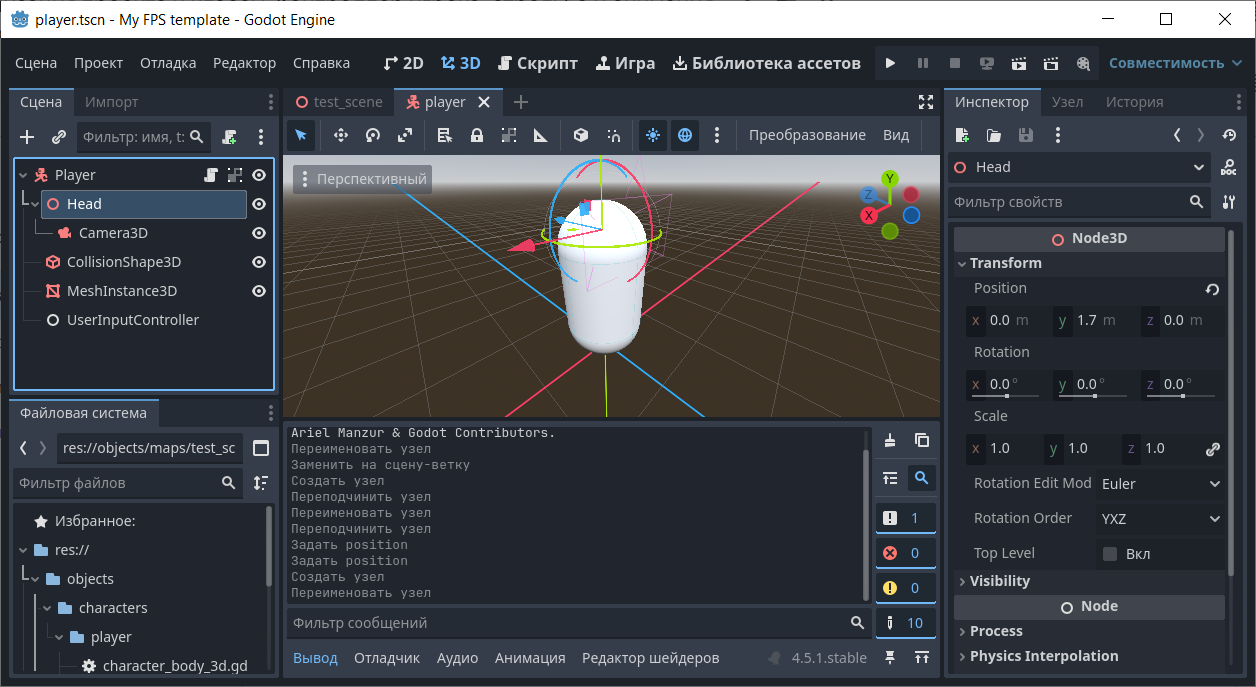 По этой причине я решил выделить методы управляемой нами “куклы”, в отдельный класс, и прицепить ему контроллер для нашего управления. Во-первых, рекомендую добавить простой узел Node3D для позиционирования головы (так и назовите, “Head”), так как на неё мы будем вешать много чего в будущем, и так проще позиционировать, вращать “всю голову”. Добавьте простой узел Node, который будет ответственен за передачу управления от клавиатуры и мыши к персонажу. Назовем его UserInputController. Должно получиться как на рисунке 4.
