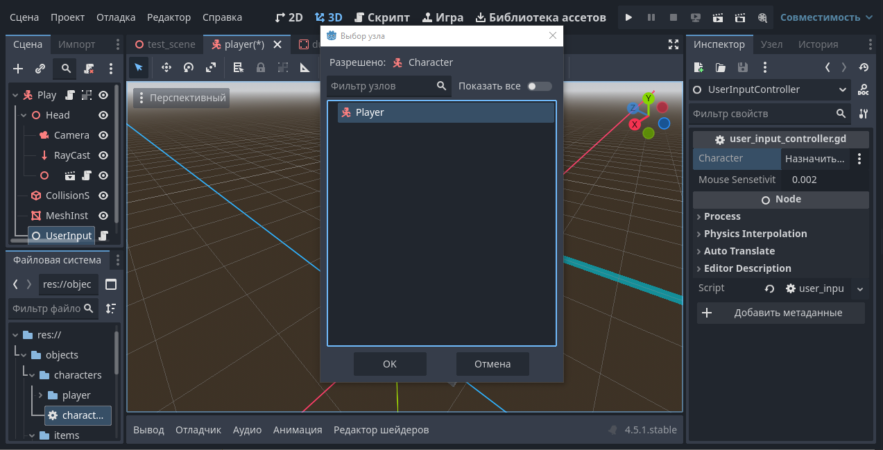 Скрипт управления пользователем сделан для игрока, а вот нынешний скрипт “character.gd” запланирован универсальным. Исходя из этого “character.gd” переместится в папку “objects/characters”.