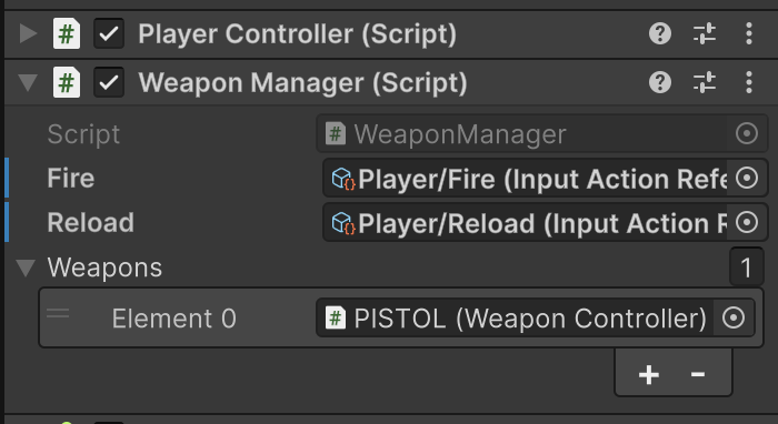 }Этот скрипт помещается на объект игрока, в нем надо указать экшены ввода для стрельбы и перезарядки, которые мы задали до этого, а так же оружие, которое настраивали до этого. После этого попробуйте протестировать стрельбу.