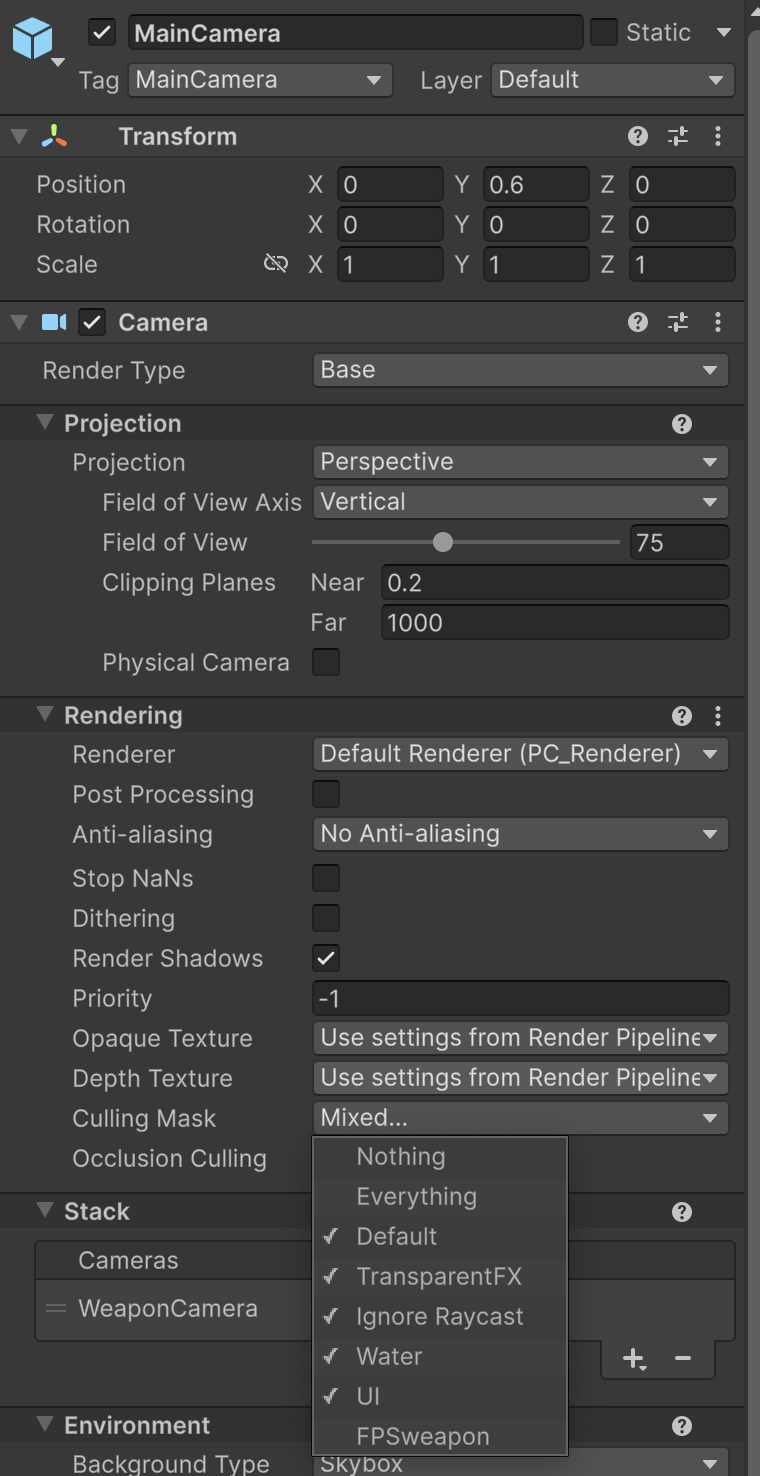 Такая проблема решается отдельной камерой для отрисовки оружия. Мы добавим отдельную камеру, которая будет видеть только оружие и отрисовывать его поверх того, что видит основная камера.