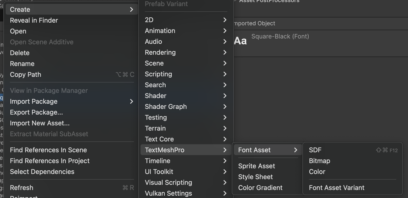 TextMeshPro -– это альтернатива обычному текстовому компоненту, которая лишена проблемы разной кодировки шрифтов на разных устройствах, поскольку хранит шрифт в виде меша. Чтобы использовать на этом компоненте свой шрифт, необходимо создать на его основе FontAsset (ПКМ на шрифт > Create > TextMeshPro> FontAsset > SDF), который затем указывается в текстовом компоненте.
