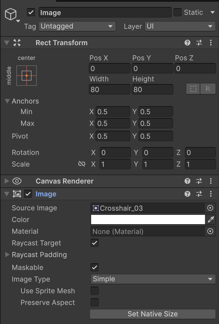 Для того, чтобы поставить своё изображение прицела, поместите спрайт в поле Source Image компонента Image.