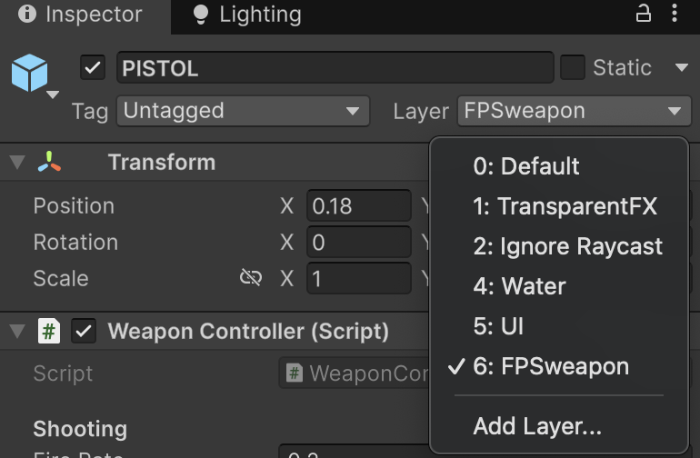 Первым делом создайте новый физический слой (Layer) и назначьте его объекту оружия