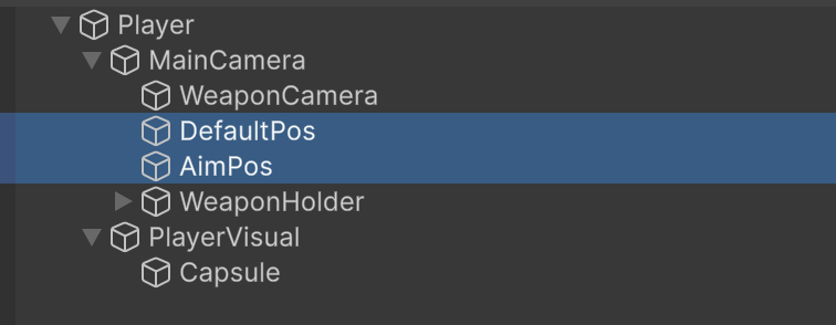 Создайте внутри основной камеры два пустых объекта (можете сделать 3D объекты без физики или добавить объектам иконку, чтобы видеть их расположение). Установите положение объекта DefaultPos в соответсвии с положением вашего оружия (в районе правой руки), а положение AimPos по середине перед камерой, чуть выше DefaultPos.
