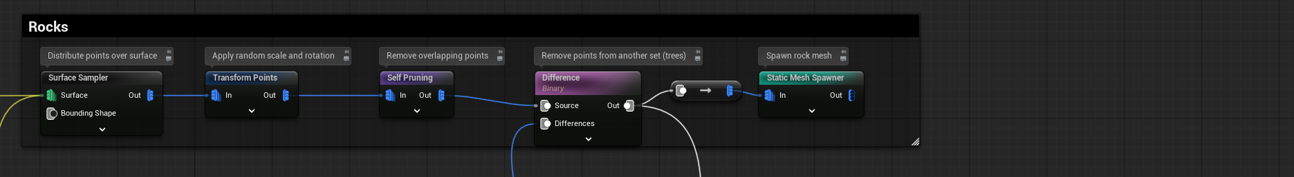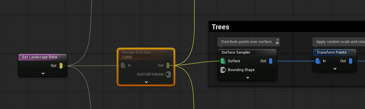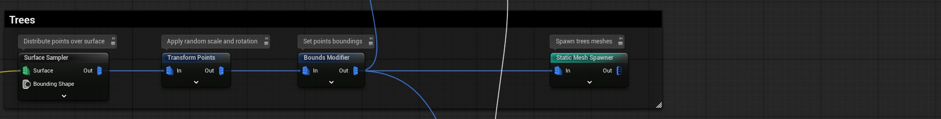 Transform Points - позволяет нам добавить рандомность расположению/вращению/скейлу что назначаться на точку и потом будут скопированы на мешку прописанную в ноде Static Mesh Spawner.