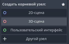 Для начала необходимо создать корневой узел игровой сцены. Обычно это стандартный узел – Node3D. Для его создания достаточно нажать в окне сцены “3D сцена” (рис. 4).