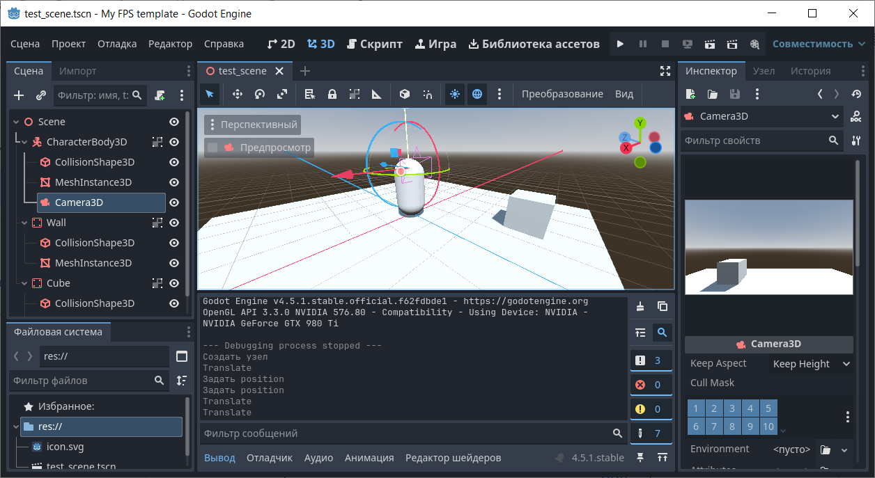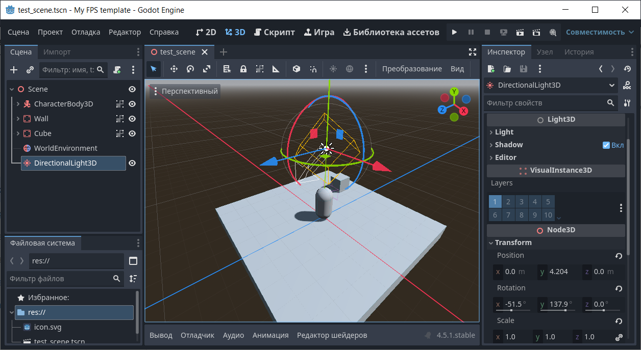 Был сделан заметный прогресс, который не хочется бесследно потерять. Сохраните созданную игровую сцену, выбрав сверху экрана “Сцена → Сохранить сцену”, или комбинацией Ctrl + S. По умолчанию название сохраняемой сцены берется из названия корневого узла. Я назову “TestScene”. Кидаем прямо в корень папки проекта, не стесняемся. Потом там приберемся.