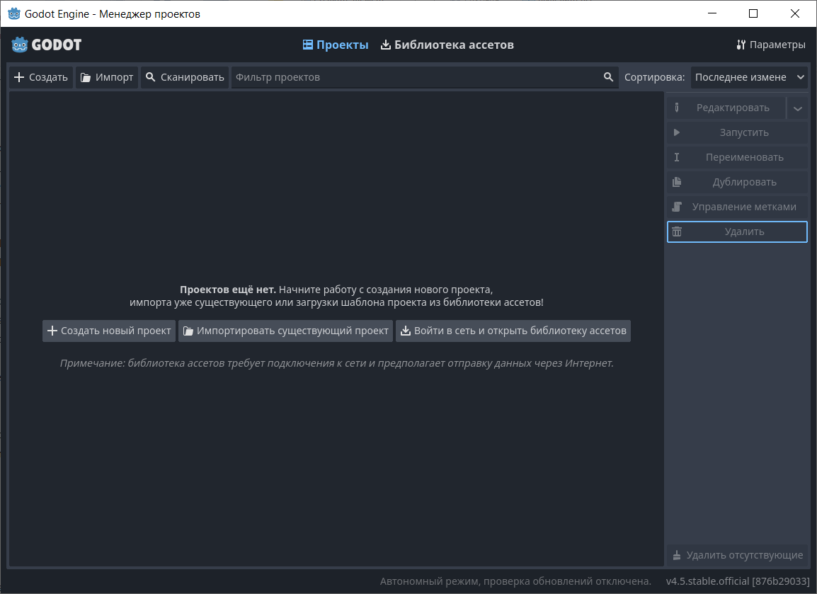 Godot представляет собой легковесный, не требующий установки игровой движок с возможностью использовать не только встроенный Python-подобный GDscript, но и C#. Проект на Godot представляет из себя совокупность «сцен», кода, ресурсов (таких как спрайты, модели, звуки и т. п.) и файлы импорта для этих ресурсов. По этой причине проекты занимают мало места и работает всё крайне быстро на довольно слабом железе. Скачать актуальную версию движка можно по ссылке. На момент написания этого урока последней версией является 4.5.