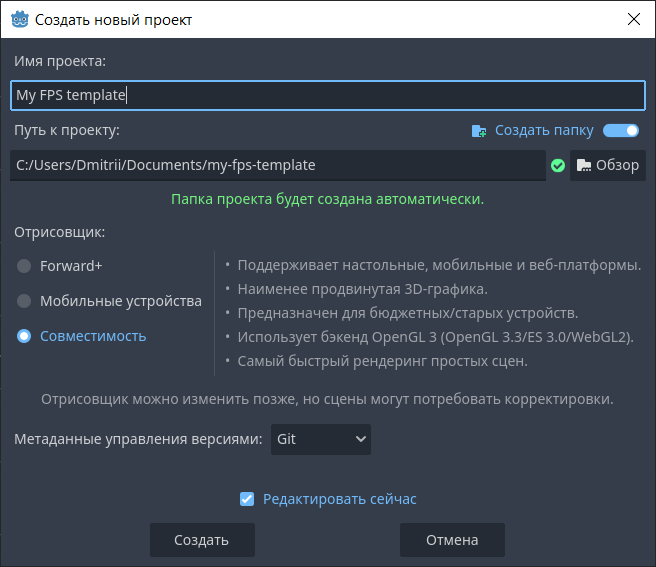По умолчанию проектов, конечно же, нет. Можно попробовать посмотреть проекты из библиотеки ассетов, но это не будет рассматриваться в рамках этого курса. Для создания своего проекта достаточно нажать на кнопку “Новый проект” и у вас откроются первоначальные настройки (рис. 2). Напишите название проекта (на английском), нажмите “Создать проект”, выберите режим отрисовки “Совместимость”. В пункте “метаданные контроля версий” выберите “Git”, если вы его знаете и используете, или “Пусто”, если не используете.