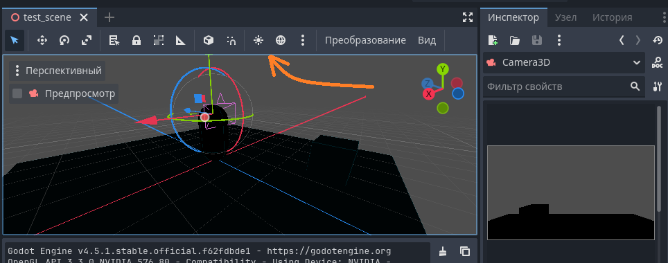 Если всё сделано правильно, можно сохранить код, сцену, и запустить проект, нажав на соответствующую кнопку в правой верхней части интерфейса. В нём вы сможете перемещать вашего персонажа в 4 стороны по нажатию стрелок (если не меняли “действия”), совершать прыжок и перемещение камеры мышью.
