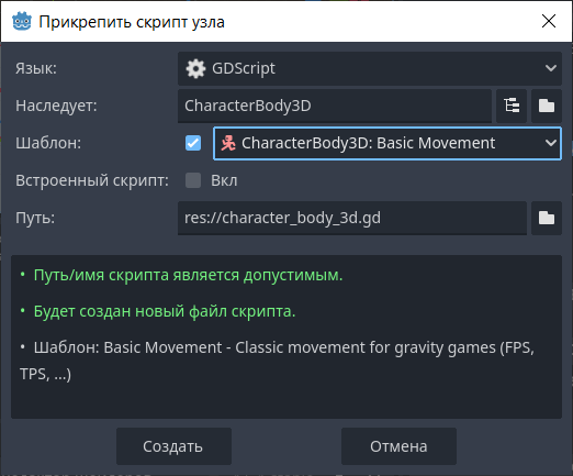 Для демонстрации программирования на движке, сделаем управление по клавишам для нашего персонажа и движение камеры мышью. Для этого выберем наш узел “Player” на сцене и “ПКМ → Прикрепить скрипт”. Появится окно создания скрипта (рис. 16).