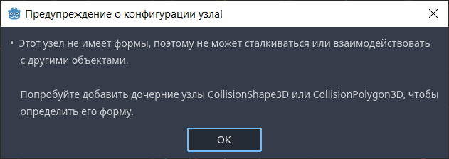 Как было написано ранее, каждый узел выполняет какой-то функционал, и CharacterBody3D специально существует для физических тел, управляемых пользователем. Вы увидите у узла “Player” предупреждение, что требуется дополнительный узел (рис. 5).