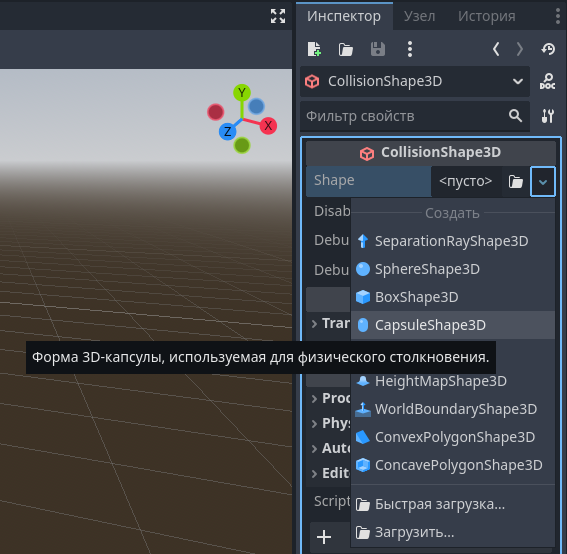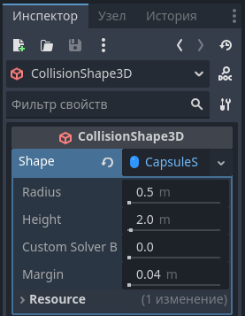 Решение описано в предупреждении – добавляем CollisionShape3D как дочерний узел для “Player”. С помощью него мы можем задать форму тела будущего героя. У этого узла также будет предупреждение, что форма не задана. Выберите узел CapsuleShape3D и справа, в “Инспекторе” задайте прямоугольную форму CapsuleShape3D (рис. 6).