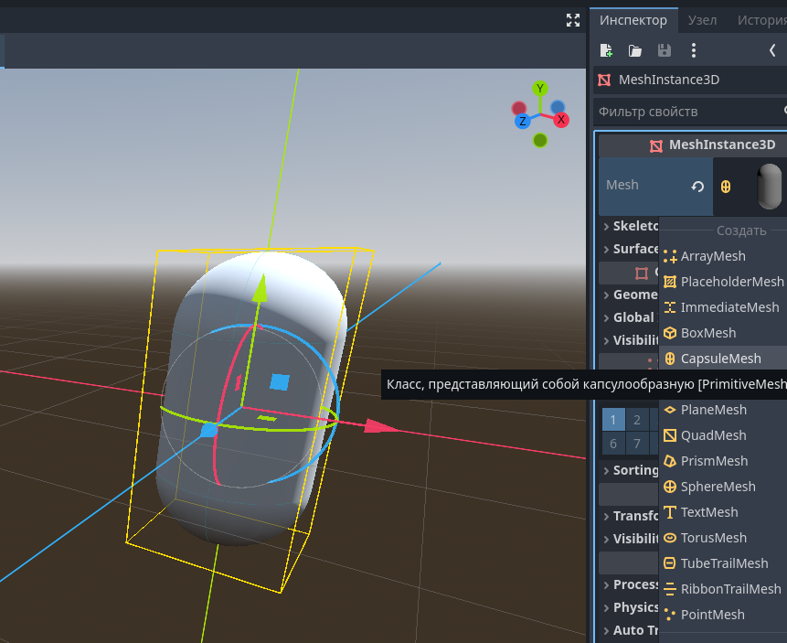 Теперь можно дать и некоторую внешность нашему персонажу, добавив “Player” дочерний узел MeshInstance3D. Пока пусть вид будет соответствовать форме: обычная капсула. В инспекторе у MeshInstance3D можете создать меш – полигональную сетку, описывающую 3D модель (рис. 8).