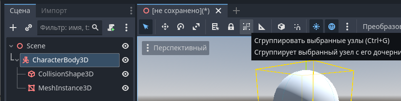Для удобства выделения и перемещения нашего персонажа во вьюпорте с помощью мыши, его можно сгруппировать. Для этого выберите узел, чьи дочерние узлы будут сгруппированы (у нас это “Player”) и нажмите на иконку “сгруппировать” (рис. 9). У узла “Player” появится иконка.