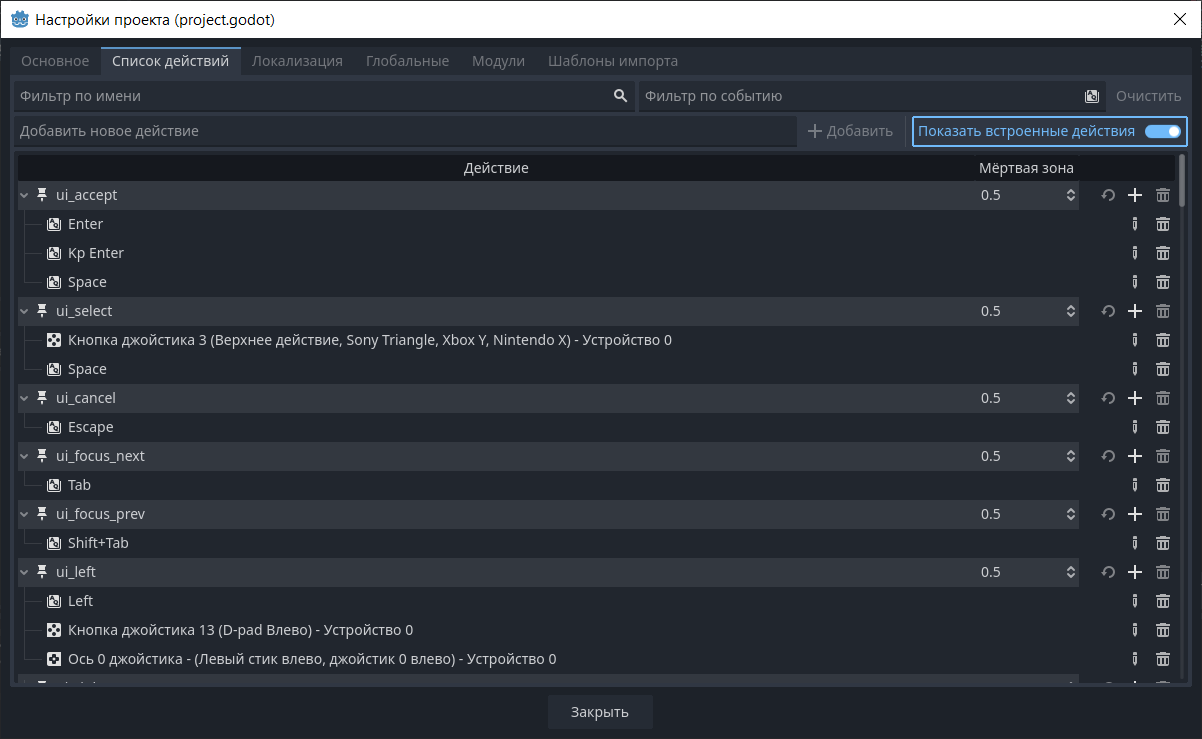 Действия ввода (input actions) – это совокупность входных сигналов, будь это нажатие клавиши клавиатуры, мыши или даже игрового контроллера, объединенных под одним названием. Таким образом вы можете настраивать управление в вашей игре, а также менять его в процессе игры и мгновенно добавлять управление с геймпада, и не только. Для того, чтобы посмотреть список действий, необходимо перейти в меню «Проект → Настройки проекта… → Список действий → Показать встроенные действия», и перед вами окажется список, который вы можете редактировать под себя (рис. 17).