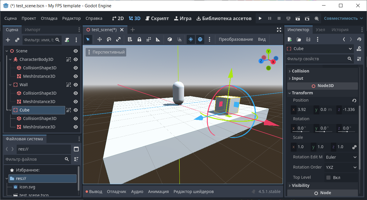Пусть наш 3D мир и будет крутиться вокруг игрока, но не состоять же только из него? Было бы неплохо добавить на игровую сцену другие объекты, и по хорошему, которые тоже имеют коллизию. Предлагаю добавить пол и кубик на этом полу, которые будут представлять из себя StaticBody3D. По отработанному на игроке сценарии собираем 2 объекта этого типа: “Wall” и “Cube” (рис. 10). Нет смысла делать полноценный огромный мир на этом этапе.