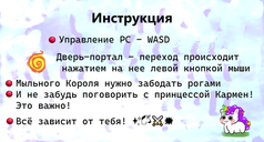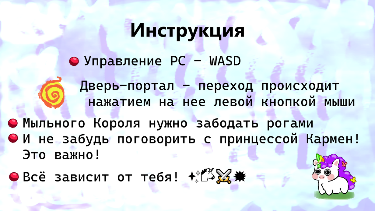 Описание: В волшебном лесу живут прекрасные единороги — сияющие, ароматные и безупречно стильные. Их чистота поддерживается магией, а потому в мыле они не нуждаются. Но беда пришла оттуда, откуда не ждали. В поле у леса Единорогов возвышается мрачный Мыльный Завод, где правит жадный Мыльный Король. Он в ярости: если единороги не покупают его мыло, значит, они его не боятся! И тогда Король решает заставить их полюбить свою продукцию — хитростью заманивает принцессу единорогов Кармен в свой замок-завод и угрожает насильно вымыть её своим мылом! Теперь только один смельчак может спасти Кармен — юный единорог Альф. Ему предстоит: ✔️ Пробраться на Мыльный Завод, ✔️ Избегать коварных ловушек и мыльных пузырей (ведь единороги их панически боятся!), ✔️ Найти принцессу, пока её магическая чистота не погибла под пеной! ✔️ Сразиться с Королем, ✔️ И вместе с К\Принцессой Кармен вернуться домой в лес Единорогов. Но Король не сдаётся без боя… Сможет ли Альф спасти Кармен и остановить мыльную угрозу? Всё зависит от тебя! ✨🦄⚔️💥